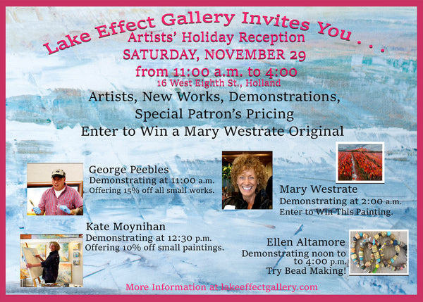 Visit with artists through out the day, enjoy painting and bead making demonstrations and enjoy the artist's special offers. Enter the drawing for a Mary Westrate painting.