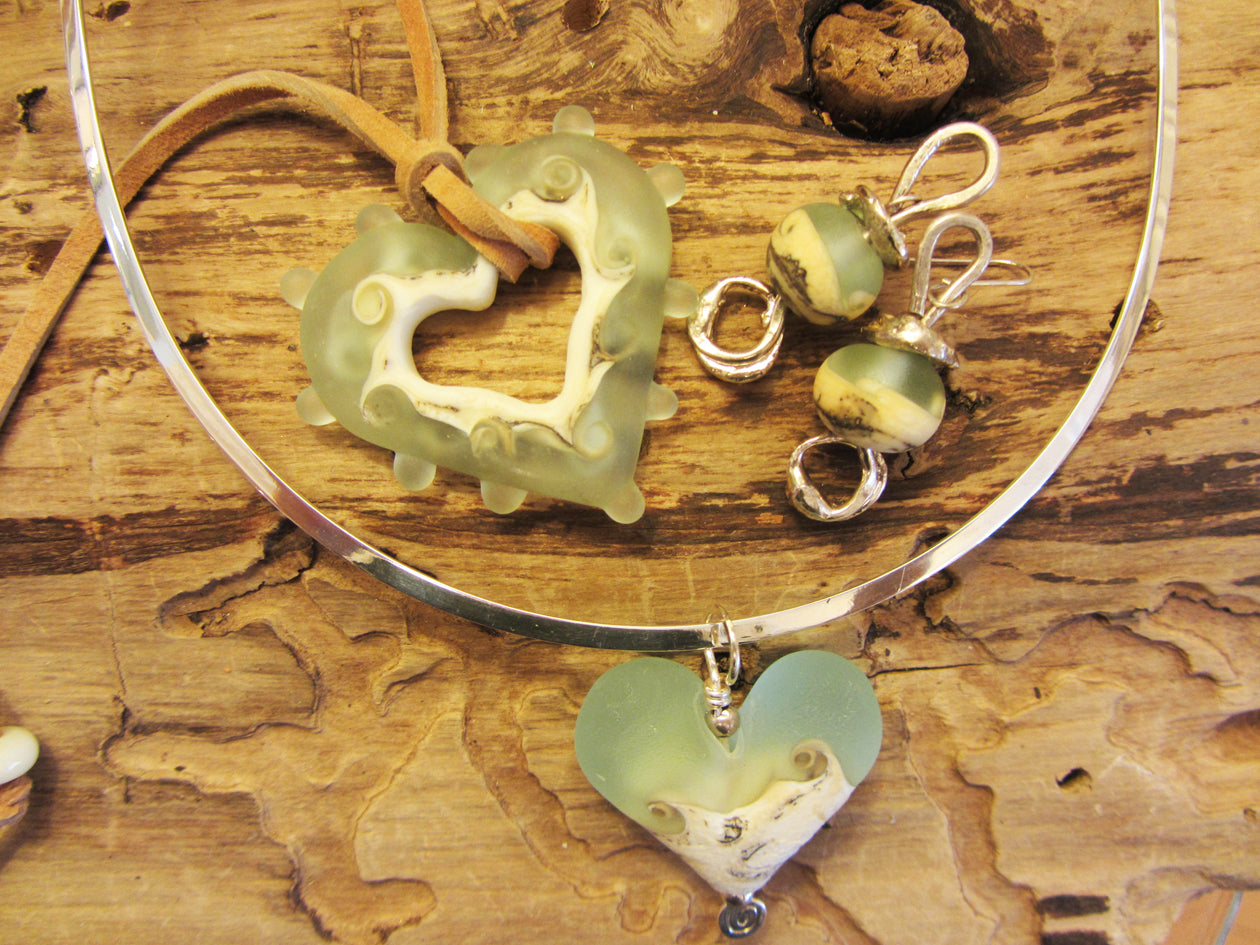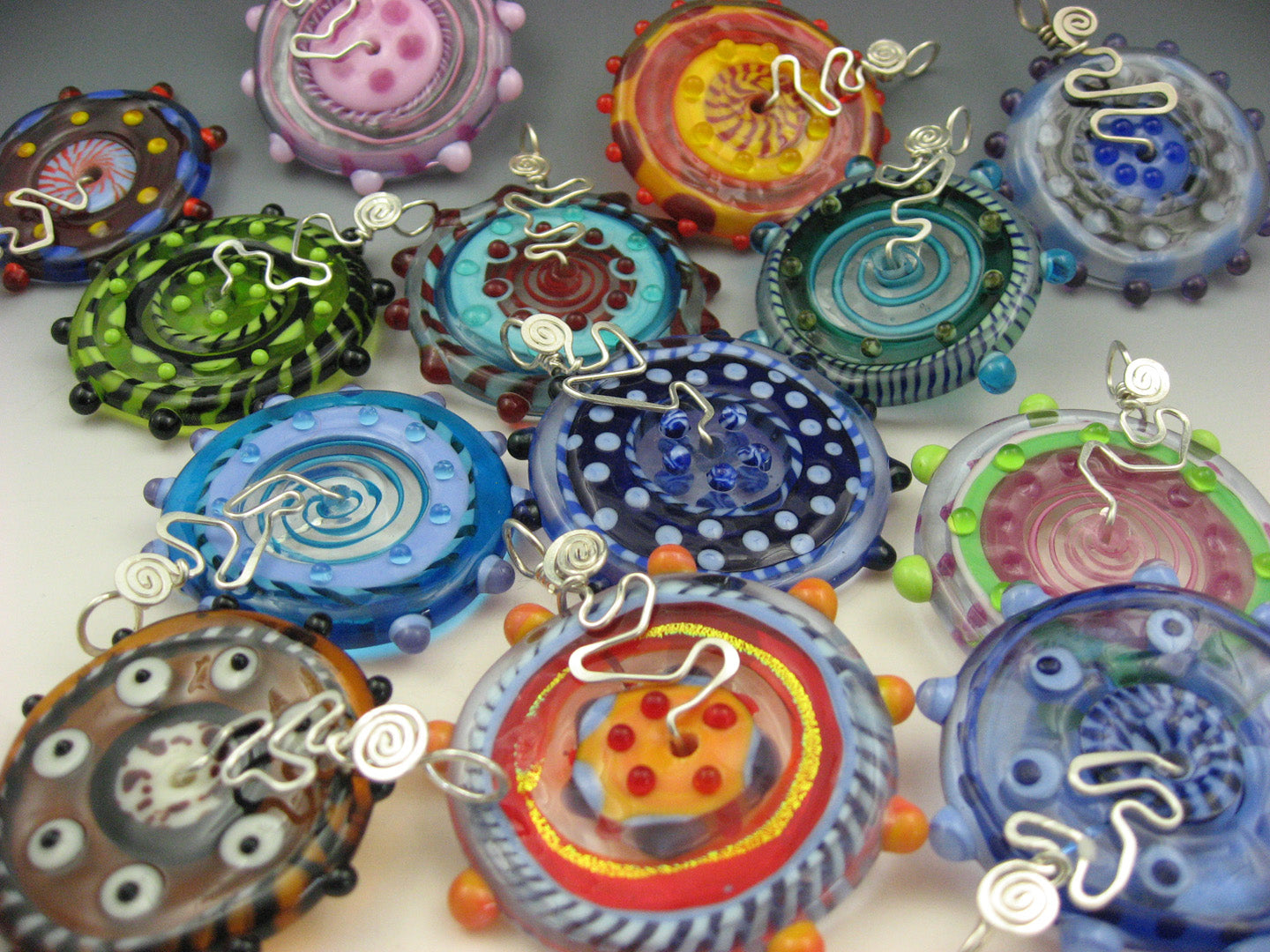 Colorful & playful, a bit zany . . . Annie Shook's lamp work glass jewelry designs have won awards for years and they keep coming. Put together several pieces for layers of color, pair up necklaces with earrings, bracelets,buttons, pins and more.