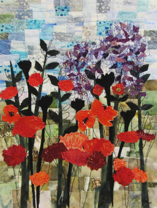 Quilted fabric "painting" by Ann Loveless. A happy garden of flourishing poppies depicted in fabric.