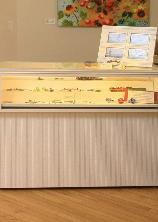 Glass top and front, jewelry or small item showcases with bead board bases. Various access glass back doors and storage doors. A great look for beach and cottage, vintage and Victorian décor. Lacquer white finish inside and out. Wired for lighting and some lights included. Units pair with the bead board cash and wrap and the bead board corner fill units and can be configured in many ways. Two units have glass shelves and two have a deep tiered drawers (19.5"W x 8.75"H x 13"D) that roll out. We featured jewelry, blown glass, ceramics and scarves in these units. They also coordinate with our rolling bead board sample and merchandise drawer units. For a complete cohesive look. Make an offer!