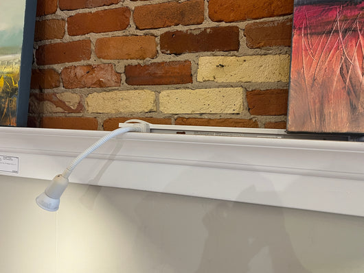 Approximately 35 gooseneck lights in two neck lengths using GU10 led bulbs. Tracks with live end plug in cords - various lengths in white. We've illuminated our art gallery and windows with these movable, plug in 110 v units which facilitate highlighting or washing merchandise and areas. Just plug the track into a standard outlet - no wiring needed.
