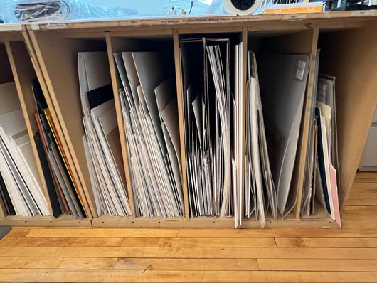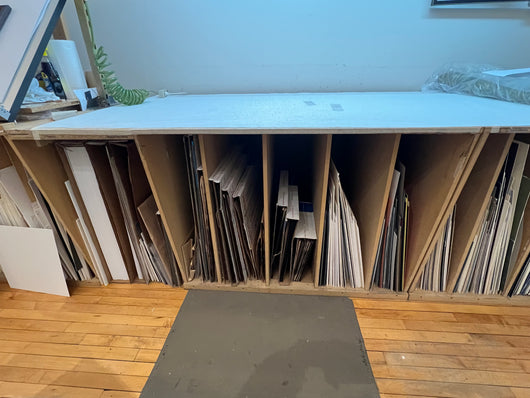 Two workbenches, each measuring 4'w x 37.5"h x 49.5"d, with five storage slots ((2) 7"w x 34"h x 42.5"d; (3) 10"w x 34"h x 42.5d). The slotted storage spaces can hold 32" x 40" size sheets of material. Countertop workspace measures 37.5" x 4'w x 49.5d. The workbenches are currently bolted together, but can be dismantled and moved.